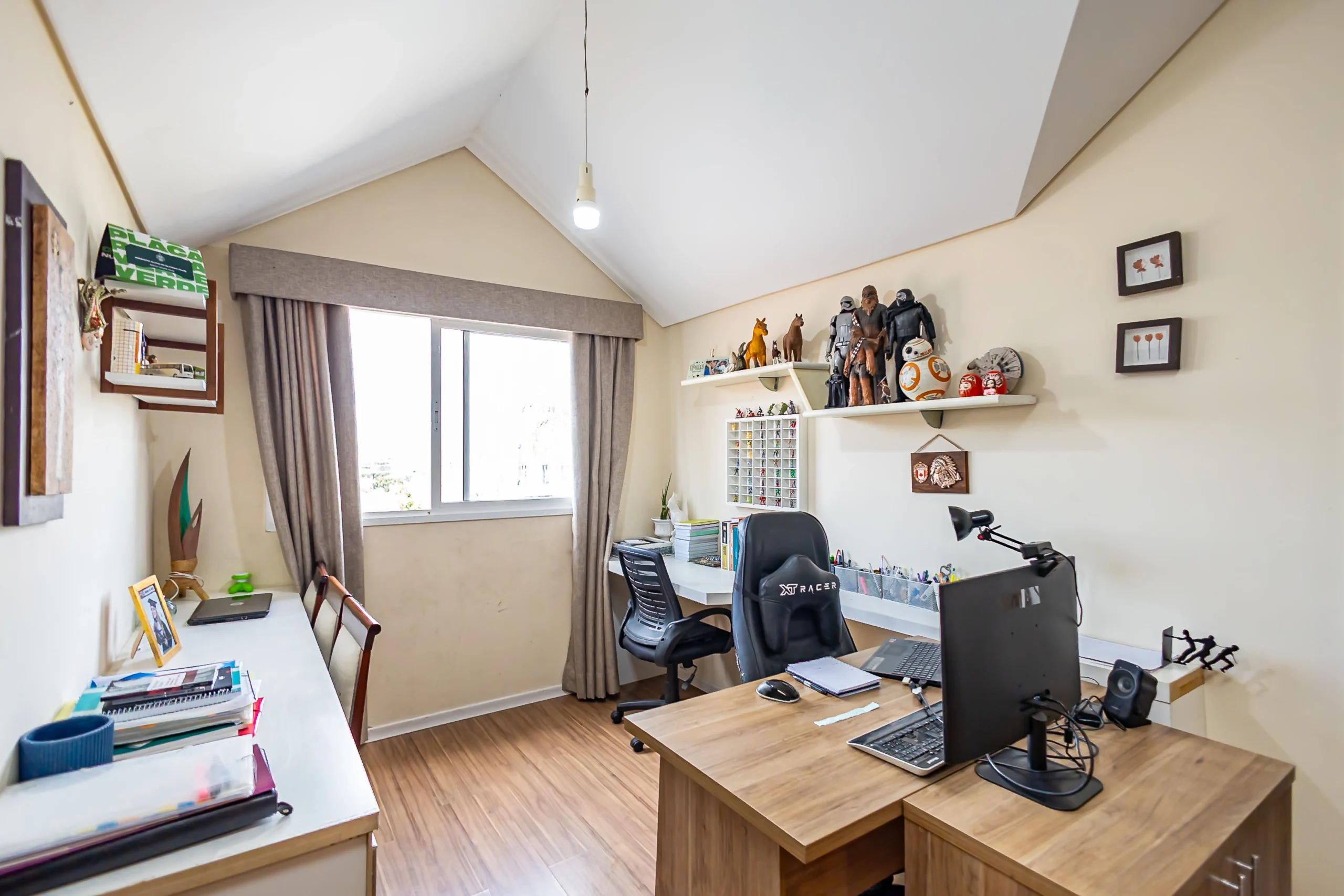 Sim, o imóvel possui um escritório integrado ao ático, ideal para trabalho remoto.